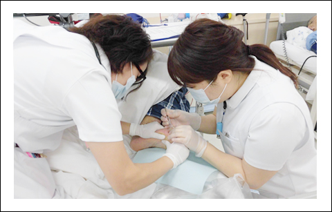 私たちは、事故のない安全で安心な看護ケアを実施することを念頭に、患者さん個々の人格を尊重し、笑顔で対応しています。